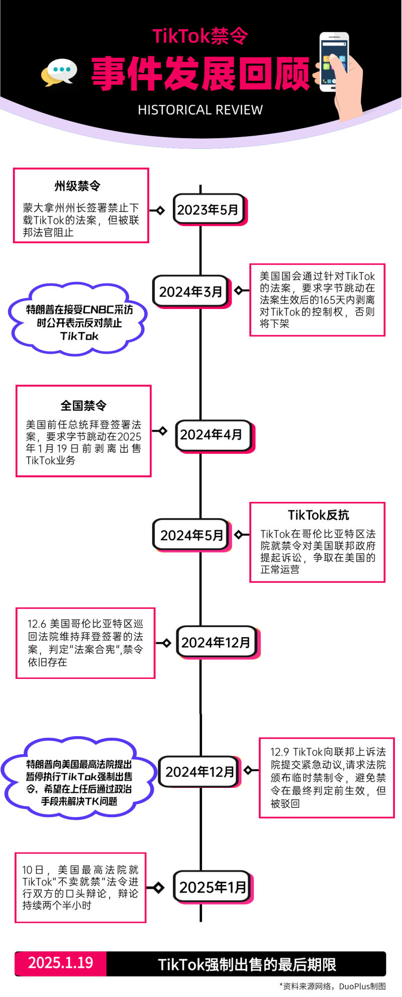 TikTok用户基数大、互动性强,是美国最受欢迎的短视频平台之一,用户会在上面发布各种视频或者直播带货,不少内容创作者通过TikTok进行内容变现,而美国政府对TikTok的态度一直不太乐观,关于TikTok禁令的相关时间梳理如下: